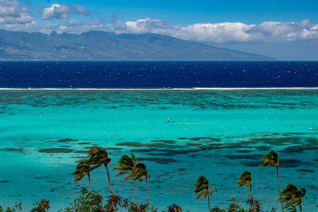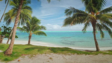 Lush palm trees rising on a beautiful white sand beach bordering a turquoise lagoon, with shades of blue and green, in a tropical paradise in French Polynesia