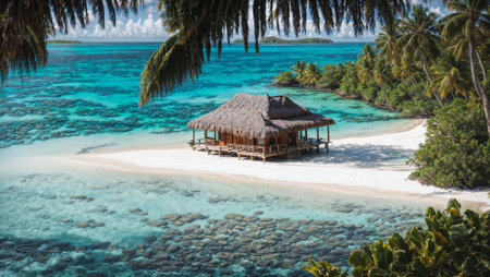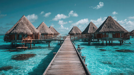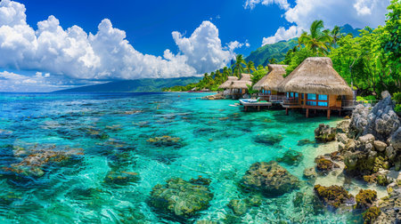 Crystal clear water is bathing luxurious bungalows built on a coral reef in a tropical paradise