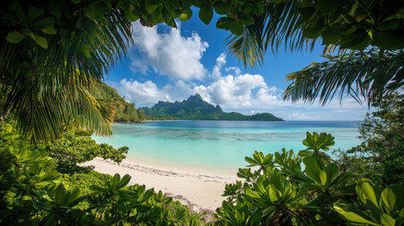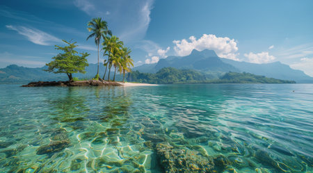 Experience a serene tropical paradise featuring lush greenery and clear blue waters. This tranquil landscape captures the beauty of nature