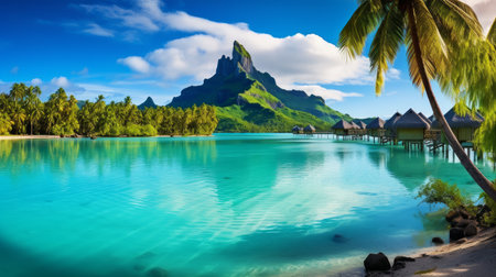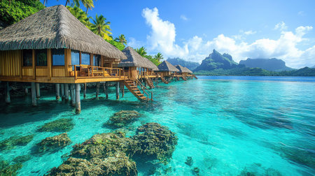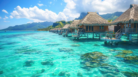 Picturesque overwater bungalows with thatched roofs, serene lagoon, majestic mountain backdrop