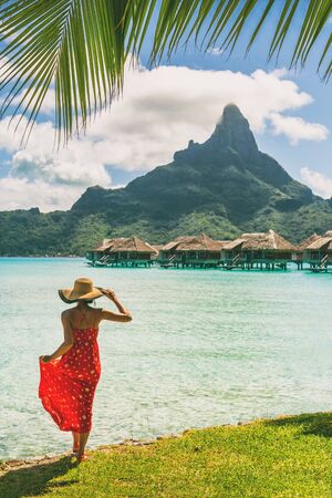 Bora Bora Travel vacation holidays. Woman in French Polynesia on paradise Motu on Bora Bora with Mount Otemanu in background. People on dream vacation destination