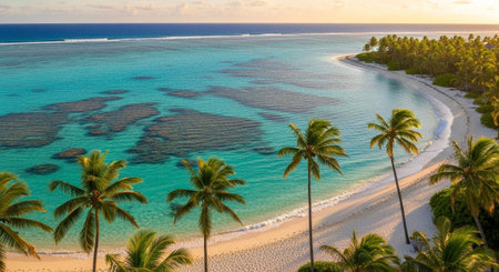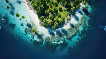 top view of a tropical island, white sandy beaches meeting crystal clear blue waters, palm trees scattered across the shore