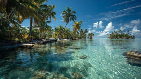 A serene lagoon is the central focus, showcasing clear, turquoise water reflecting a bright blue sky and fluffy white clouds. Palm trees line the shore, with lush green foliage adding a vibrant contrast. This image uses a wide angle perspective and would be suitable for travel, tourism, and environmental projects.