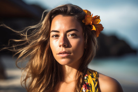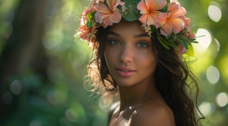 Portrait of a beautiful young Hawaiian woman, smiling, flowers