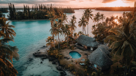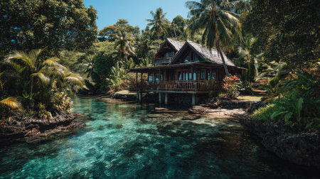 A picturesque tropical house nestled among palm trees, overlooking crystal clear waters. Experience peace and serenity in this idyllic natural setting.