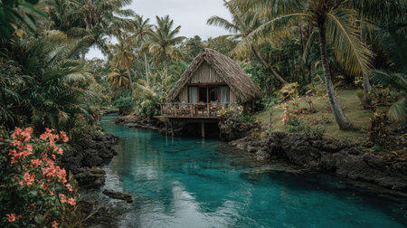 Discover a peaceful island retreat featuring a charming bamboo house surrounded by lush tropical vegetation and crystal-clear water. Perfect for relaxation.