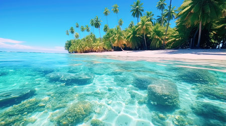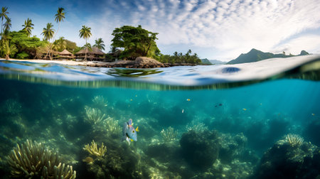 A breathtaking underwater scene displaying vibrant coral formations beneath a clear ocean surface, framed by a lush tropical shoreline and a bright blue sky above.