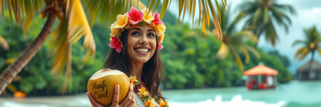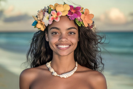 Smiling young woman wearing a floral crown and seashell necklace on a tropical beach, with wind-blown hair and a serene ocean backdrop