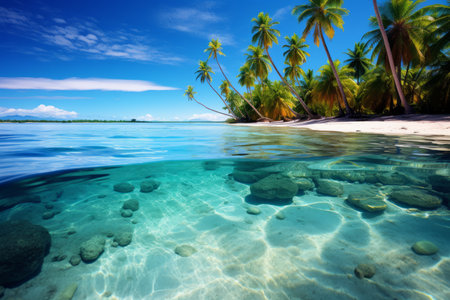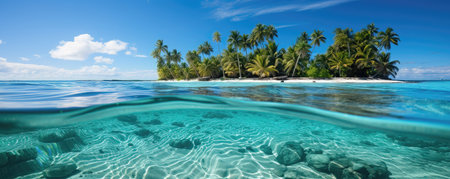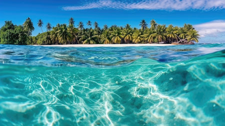 Split underwater photo of beautiful tropical island with palm trees and turquoise sea