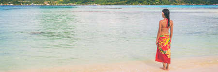 Beach summer polynesian skirt woman relaxing walking on sand and ocean background. Banner travel panorama concept. Hawaii, Tahiti clothing.