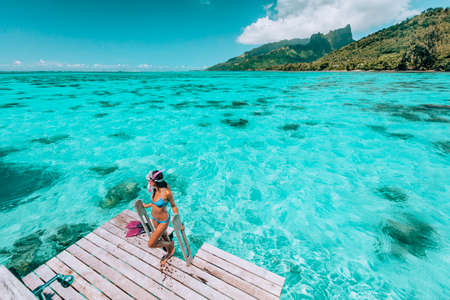 Travel Vacation Snorkeling. Snorkel swim woman going snorkeling in coral reefs for tropical water fun at resort with snorkelling mask, fins