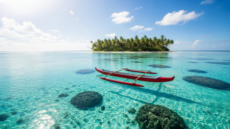 Peaceful showing idyllic tropical island paradise with a red outrigger canoe floating in crystal clear turquoise...