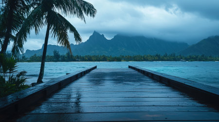 Experience a tranquil tropical paradise with palm trees swaying gently in the breeze, framed by majestic mountains and warm golden sunlight.