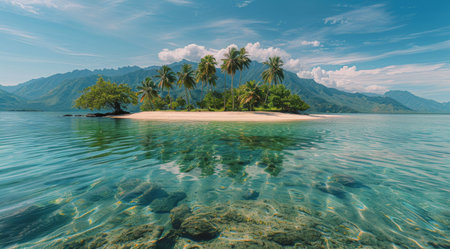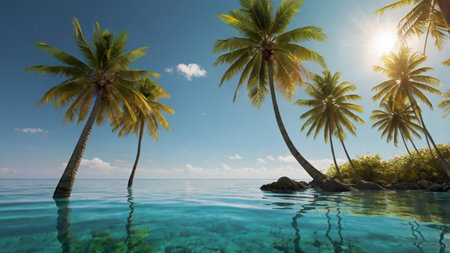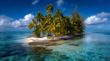Discover your dream tropical escape with this stunning view of a secluded island. Crystal clear turquoise waters lap against a white sand beach, fringed by lush palm trees. Perfect for travel, vacation, and lifestyle themes.