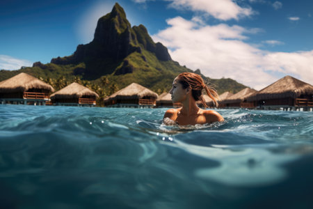 A lady swim in sea water. Summer tropical vacation concept. AI generated.