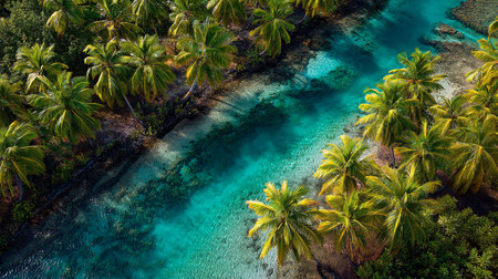 Aerial view of a tropical coastline with lush palm trees and calm waters