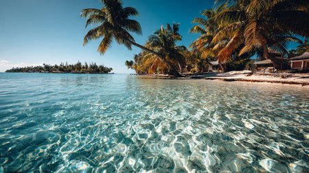 Quiet and calm lagoon on the island with crystal clear, azure water bungalows over the water and palm trees