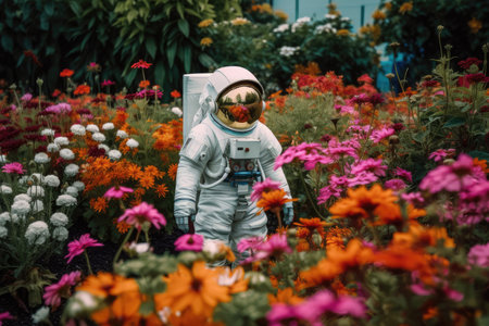 astronaut, with backpack and space suit, among colorful blooms of garden, created with generative ai