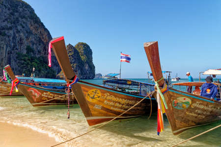 Beautiful tropical railay beach with Thai traditional wooden longtail boat at Krabi, Thailand