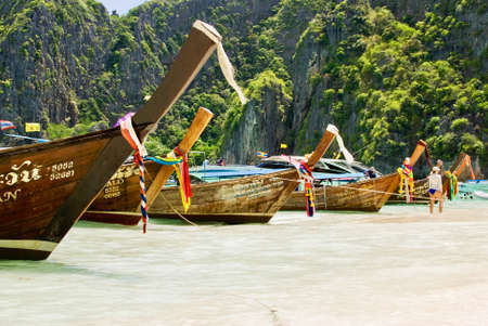 Phi Phi Islands, Thailand - March 27, 2017: Thai taxi boat noses with decoration on the shoreline