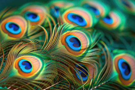 Closeup macro of vibrant peacock feather displaying iridescent colors, natural patterns, and intricate details