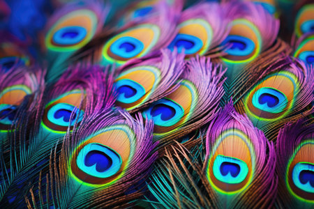 Colorful peacock feathers background. Close up of peacock feathers, Colorful peacock feathers on a colorful background. Close-up, AI Generated