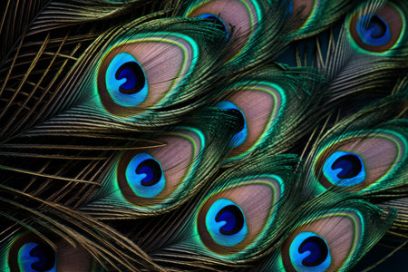 Closeup of iridescent blue and green peacock feathers creating a natural textured background
