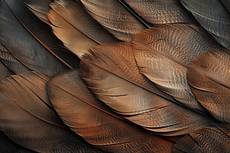 The image features a captivating array of bird feathers, showing a rich blend of earth tones. Each feather presents unique textures and patterns, beautifully isolated against a soft, neutral background. This collection reflects the natural beauty and complexity found in avian plumage.