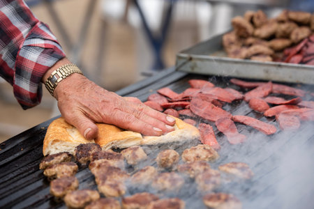 Street food in Amsterdam on sunday market. The cook is doing toasts with fried sausages and mustard.