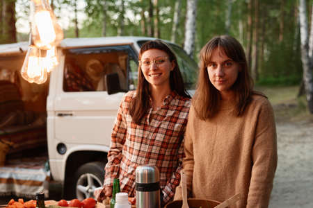 Portrait of young women smiling at camera while spending time on a picnic in the forest