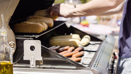 Grilling hot dogs and fresh corn on the outdoor gas grill at July 4th party.
