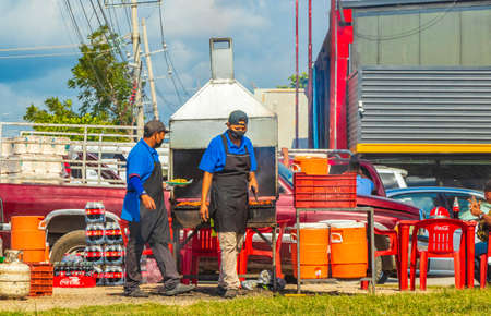 Tulum Mexico February 02, 2022 Street food fruits barbeque and drinks on typical street road and cityscape in Tulum in Mexico.