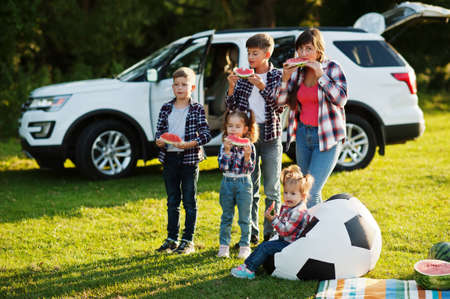 family spending time together. Four kids with mother eat watermelon outdoor.