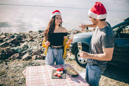 Travel, tourism - Man and woman Celebrates New Year or Christmas and drink champagne near the water at a folding portable table. Picnic near the water. Couple going on Adventure. Car travel concept.