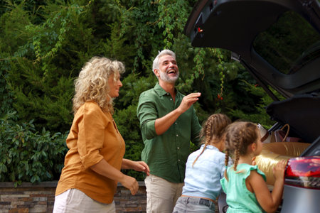 Young child going on vacation with family, preparing to leave on summer holiday at seaside with parents and grandparents. Putting luggage in vehicle trunk to travel to journey destination.
