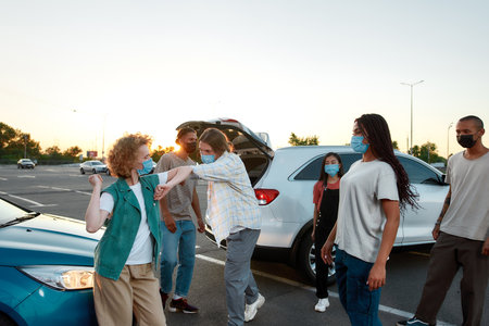 Young ordinary dressed friends of different nationalities greeting each other with elbows wearing masks standing outside on a parking site with their cars on a background