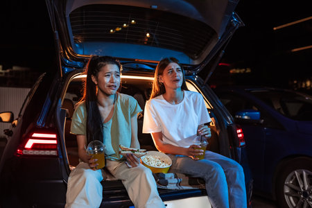 Two young women, best friends looking emotional while sitting in car trunk, having snacks and watching a movie in an outdoor cinema in the evening