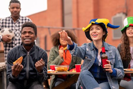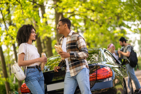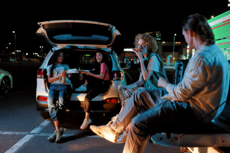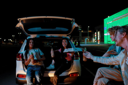 Young well-dressed friends of different nationalities sitting in opened car trunks in front of each other outside on a parking site eating pizza and drinking beer