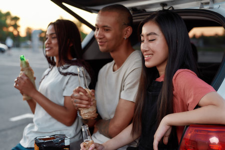 A group of three young casually dressed friends of different nationalities sitting in an opened car trunk outside on a parking site smiling and drinking beer