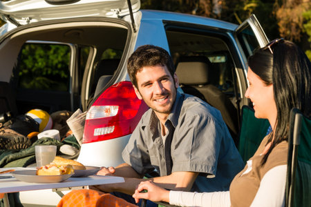 Beautiful young of a couple having romantic time drinking drinks in the car trunk on the sunset