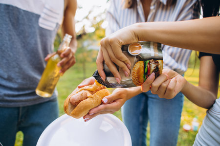 Cropped portrait of young people cooking junk food for picnic together on warm summer day