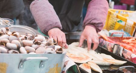Unidentified merchant cooking food from boiled Pond Snail or Marsh snail as Korean traditional street food closeup