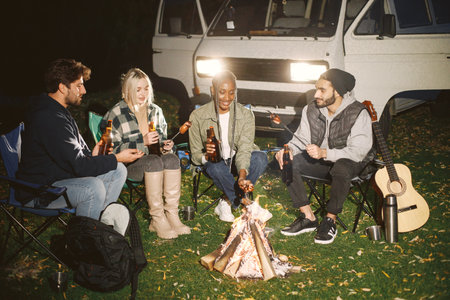 Tourist couples camping, grilling, drinking beer-alcohol, clashing beer bottles, ready for a fun, happy summer party.