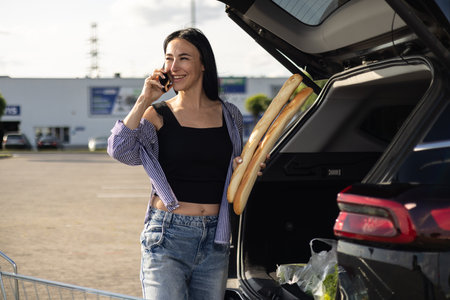 young brunette woman standing in supermarket parking lot with shopping cart next to car with open trunk and talking on phone