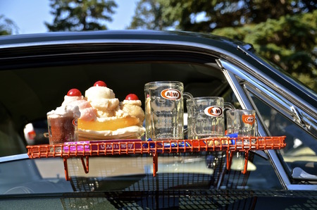 BISMARCK, NORTH DAKOTA, August 1, 2015: The Mustang and Ford car show takes place yearly on the capital grounds during the Capital AFair and finds a Ford car with a A W Root Beer platter attached to a window.