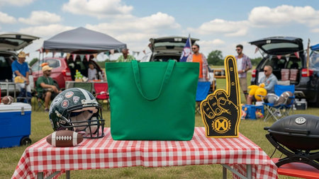 Tailgating party with cheeseburger, hot dog, potato chips, pom poms, and football Football field in background