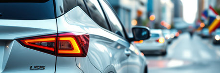 Close-up of contemporary car tail lights, displaying intricate design and illumination, emphasizing modern automotive technology and craftsmanship in vehicle aesthetics