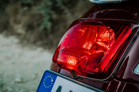Taillights, brake light and turn signal of retro red scooter close-up view.