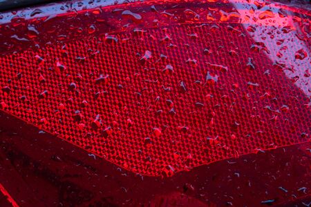Close-up of the red tail light of a modern car with raindrops.