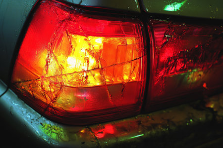 Close up of a damaged car taillight showcasing vibrant colors and reflections in a garage